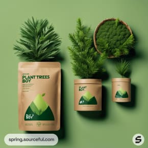 Green packaging with tree images on resealable pouches and boxes.