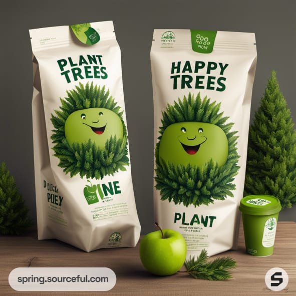 Eco-friendly packaging with tree graphics on resealable pouches and cups.