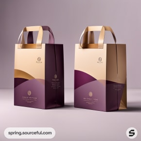 Elegant paper shopping bags with purple and beige geometric design and sturdy handles, set against a neutral background.