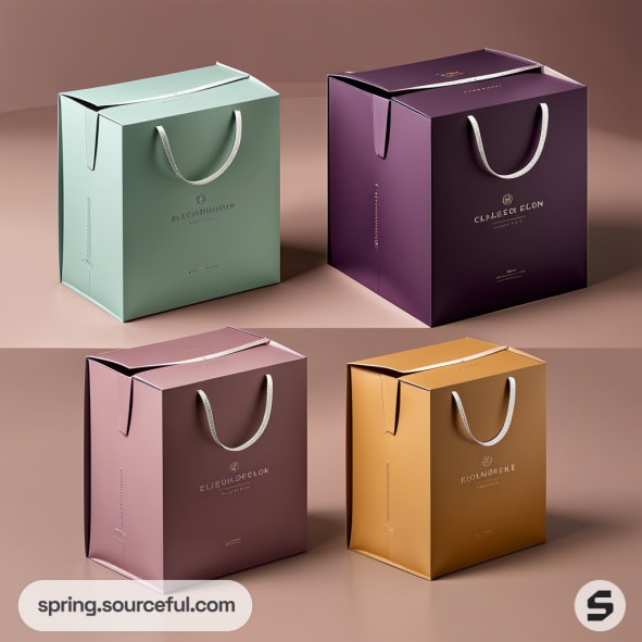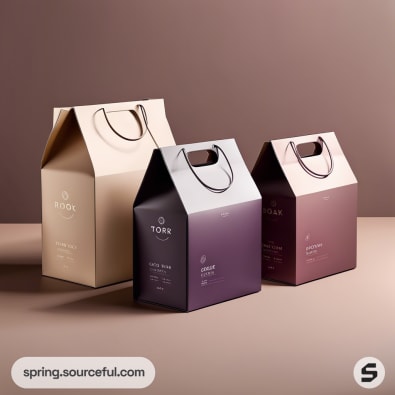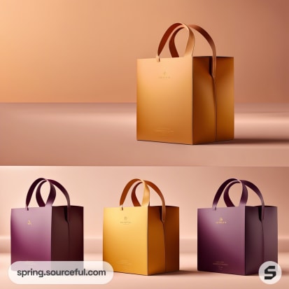 Elegant paper bags with leather handles in brown, yellow, and purple hues against a gradient backdrop.