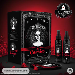 Box with gothic theme, woman illustration, and two spray bottles, 'Curves' labeled.