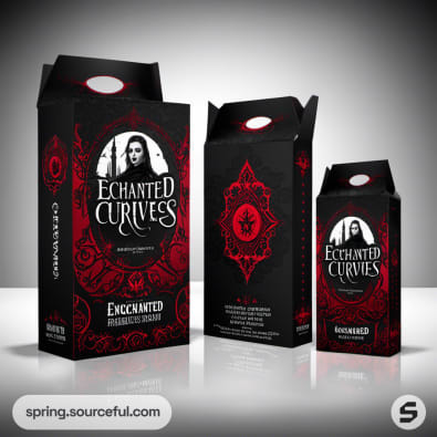 Black and red gothic-themed packaging with a woman illustration, labeled 'Enchanted Curves'.