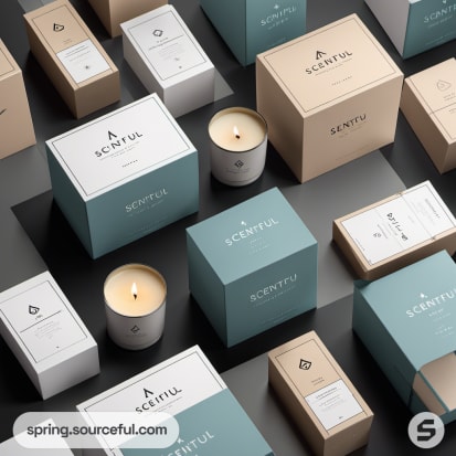 Assortment of candle boxes in black, teal, and beige.