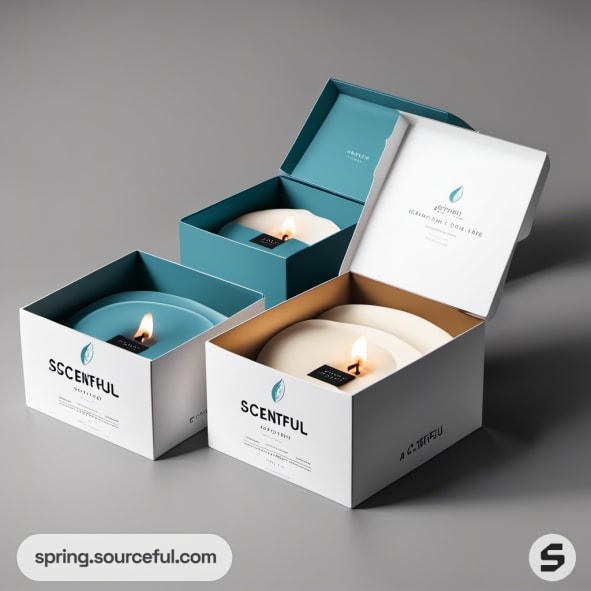 Two open candle boxes with teal and white candles inside.