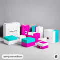 Colorful mailer boxes in teal, purple, pink, and white arranged on a neutral background.