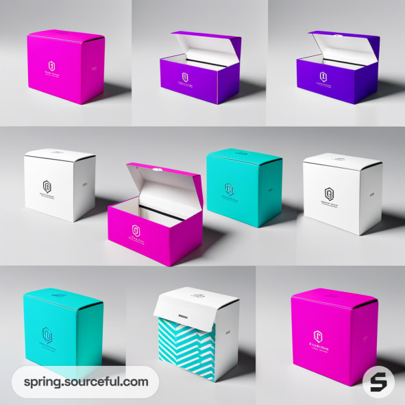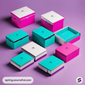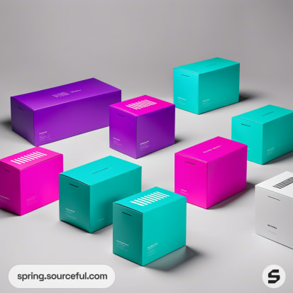 Colorful rigid boxes in aqua, pink, and white on purple surface.