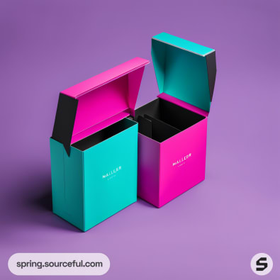 Pink and teal mailer boxes with open lids on a purple background.