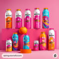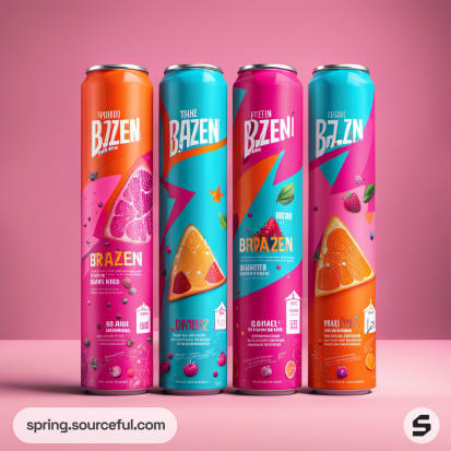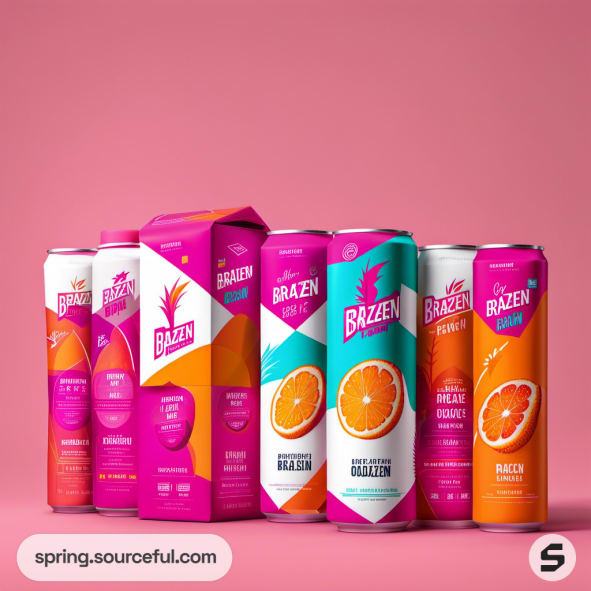 Colorful cans and boxes with fruit illustrations on a pink background.