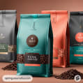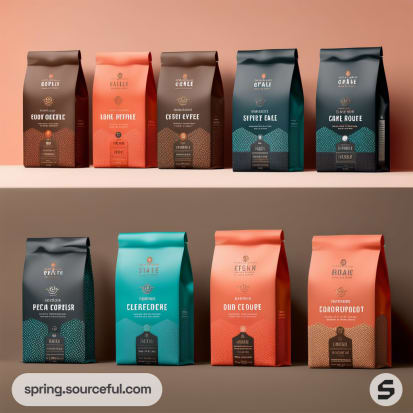 Assorted coffee pouches with beans and a small box, in teal and coral shades.
