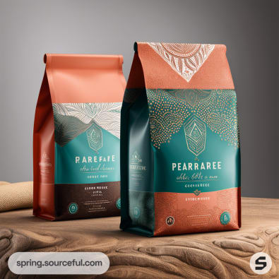 Two coffee bags in coral and teal with intricate patterns and a wooden background.