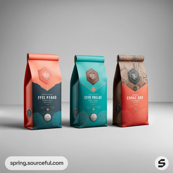 Three colorful coffee bags in coral, teal, and brown with patterns and text designs.