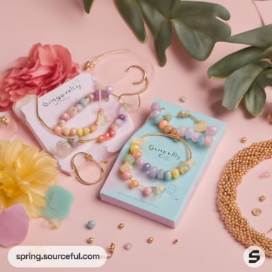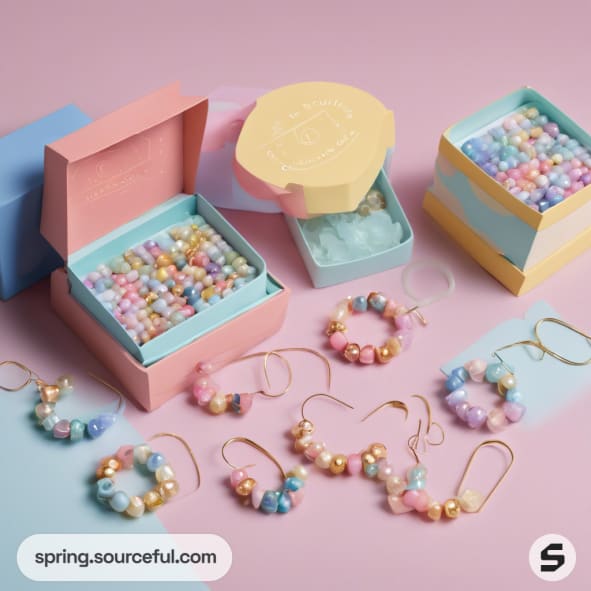 Discover the perfect packaging inspiration for our DIY Creole earring kit, featuring golden steel and multicolored jade beads. Our product carton box is designed with an illustrative, cute, and pastel aesthetic, reflecting the light red, yellow, blue, and purple color scheme. This packaging not only protects your DIY earring kit but also adds a touch of charm and creativity. Experience the joy of creating your own Creole earrings with our beautifully packaged, easy-to-use kit.