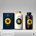 Blue and black bottles with matching star packaging, minimalist style.