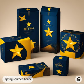 Dark blue and gold boxes with prominent star designs, various shapes.