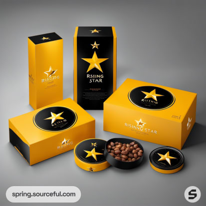 Dark blue and yellow boxes with star design, mailer packaging.