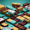 Assorted maroon, teal, and brown boxes neatly arranged on teal surface.