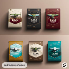 Assorted teal and brown boxes featuring drone illustrations on brown background.