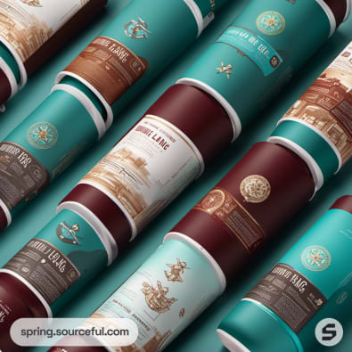 Cylindrical containers with teal and maroon designs laid on a teal surface.