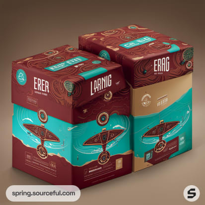 Two maroon and teal boxes with abstract boat designs on a brown surface.