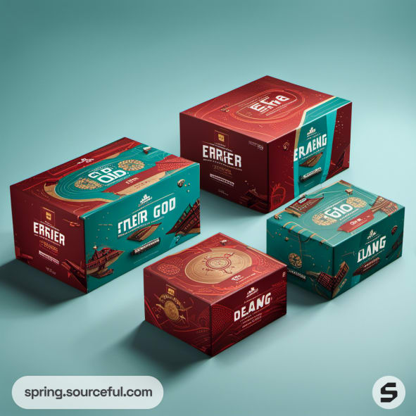 Red and teal mailer boxes with abstract designs and text on a teal background.
