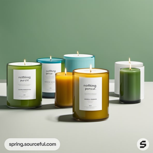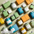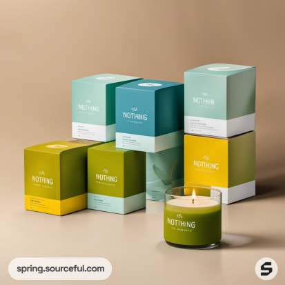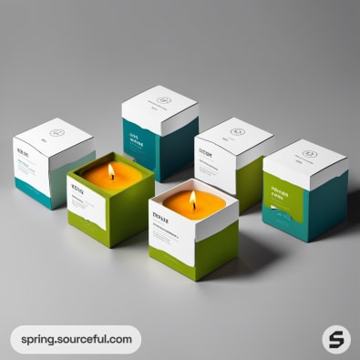 Candles in vibrant green-and-blue packaging on a gray surface.
