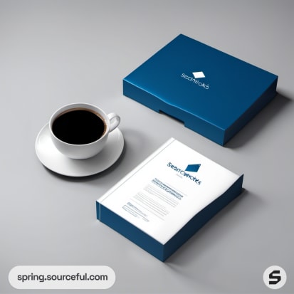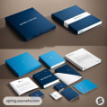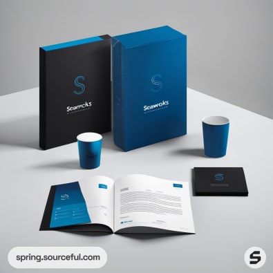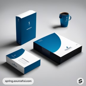 Variety of blue, black, and white branded office supplies and boxes on a gray background.