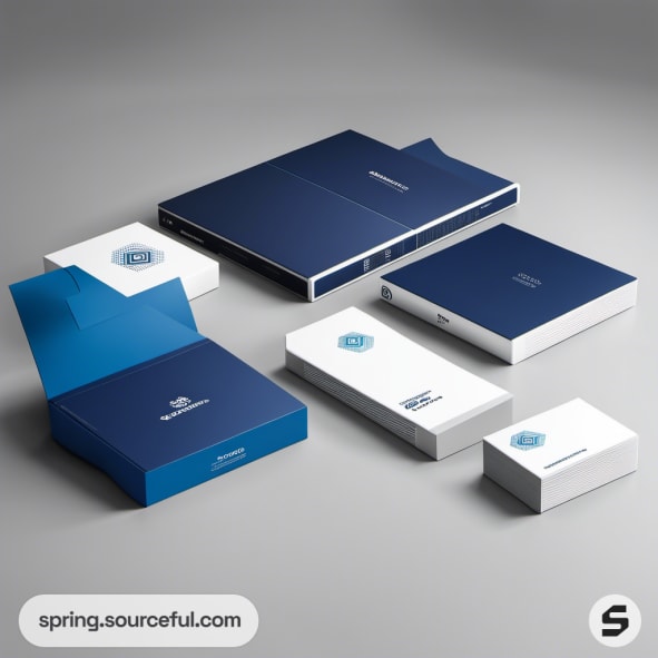 Various blue and black rectangular boxes with sleek design on a gray background.