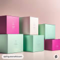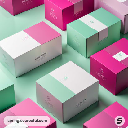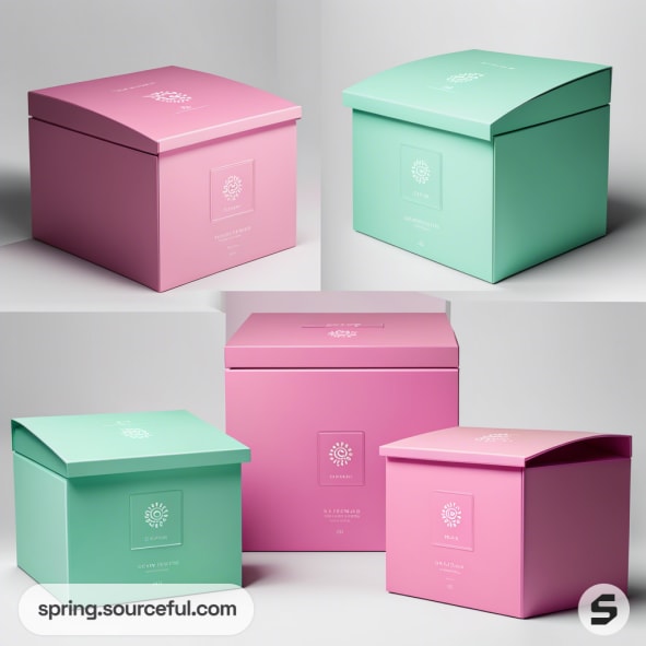 Various pastel pink and green mailer boxes arranged on a beige backdrop.