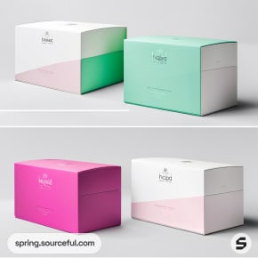 Three colorful rectangular boxes with teal, white, and pink designs set against a neutral background.