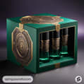 Opulent gift box with two green glass bottles, featuring ornate gold details and a dark purple exterior.
