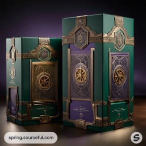 Luxurious green and purple packaging with ornate gold detailing and geometric designs.