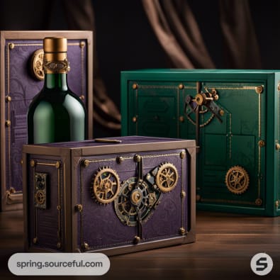 Steampunk-style boxes with gears and green wine bottle on dark background.