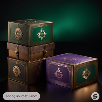 Stacked luxurious boxes with gold detailing, green and purple hues, and metallic finishes against a dark backdrop.