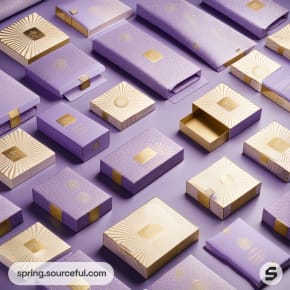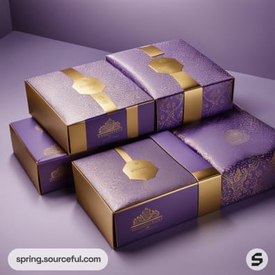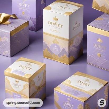 Luxurious purple and gold packaging boxes with elegant crown and geometric designs on a lavender background.