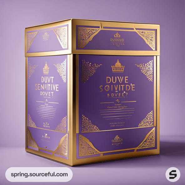 Luxury purple and gold duvet box with ornate patterns on a purple background.