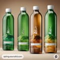 Set of four bottles with varying colors, black caps, green and brown shades, on a light green background.