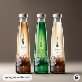 Four tall bottles; two green, one brown, with a wavy design on a golden background.