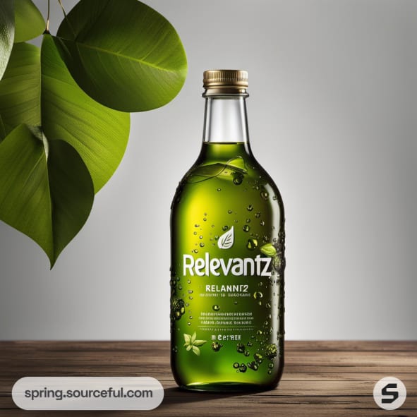 Green glass bottle with gold cap and leaf design, on wooden surface with green plant leaves in background.