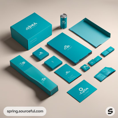 Turquoise packaging box collection on a beige background.