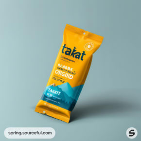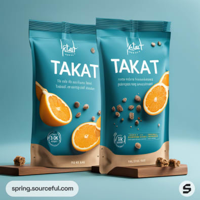 Two vertical orange and turquoise pouches with orange slices and snacks.