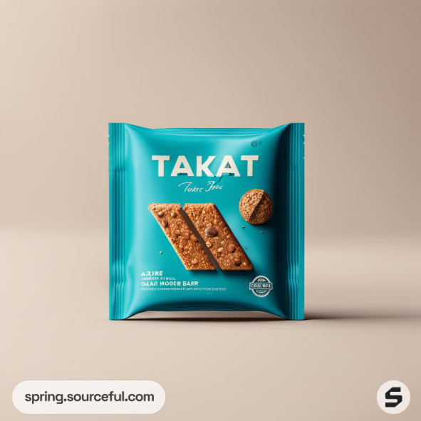 Teal snack pouch with orange and chocolate pieces on a beige surface.