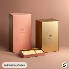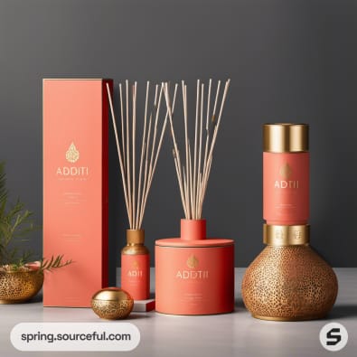 Sleek fragrance packaging with tall coral and gold bottles and diffuser.