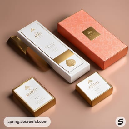 Chic rectangular gift boxes in white and gold with ornate designs.