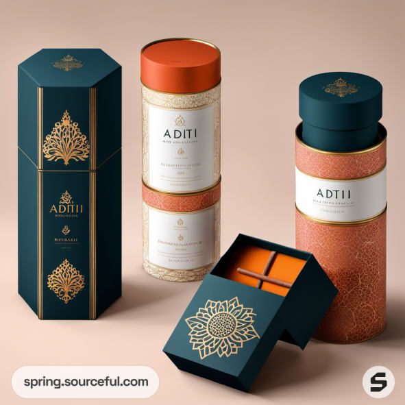 Elegant hexagonal and cylindrical boxes with floral patterns in teal and orange.