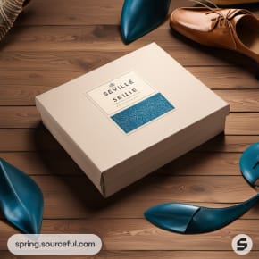 White box on wooden table with blue detail and brown shoes nearby.