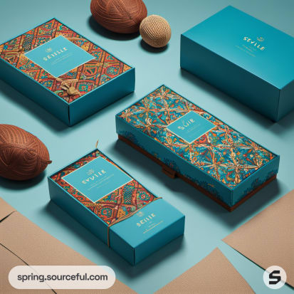 Brown and teal box with geometric designs on neutral background.