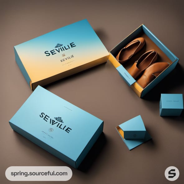 Gradient blue and orange boxes with brown loafers inside.