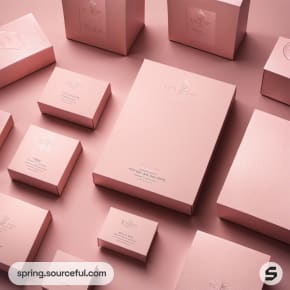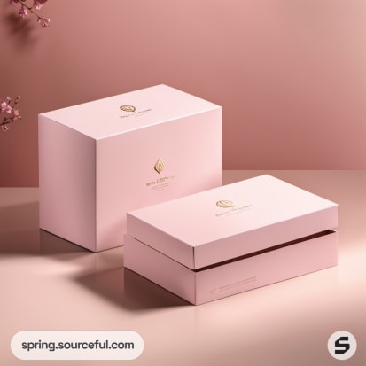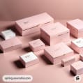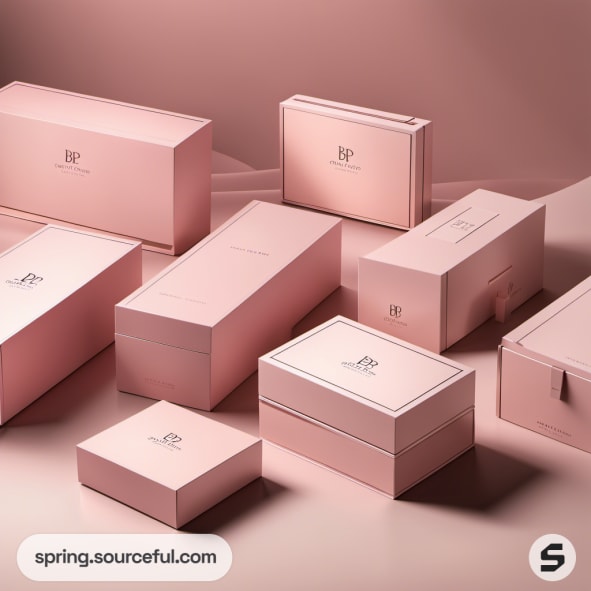 Multiple pink rectangular and square boxes on a neutral background.