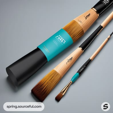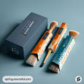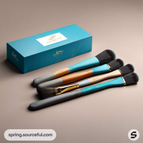 Blue box with multiple brushes featuring teal and gold accents on beige background.