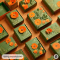 Green floral boxes with orange and yellow flower designs on an orange background.